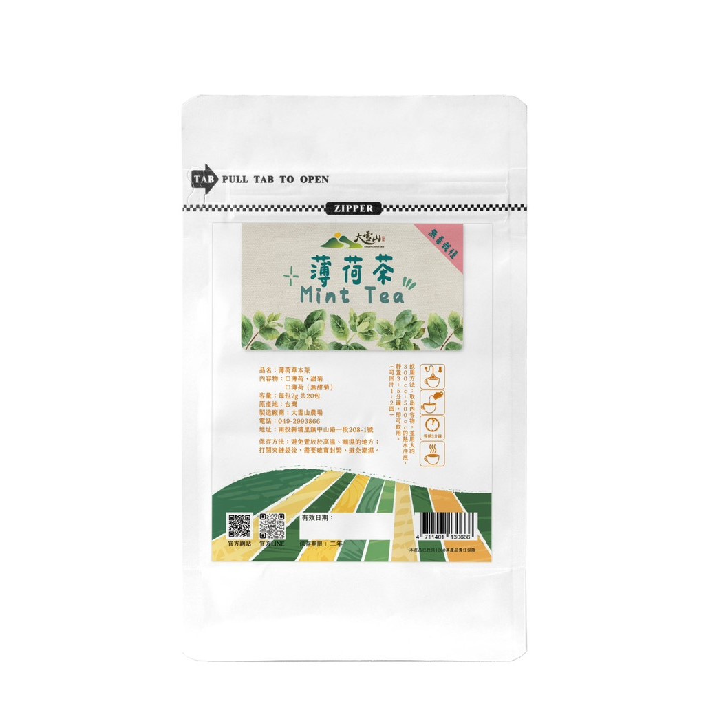 品名:薄荷茶 重量:20入,每包2g 成分:薄荷、甜菊 產地:台灣 使用方式:每次一包,請用500~600CC的熱水沖泡約三分鐘,即可飲用。 保存方法:避免陽光直射和避免置放於潮濕的地方 ***備註:寄送國外請先和農場聯繫:2993866@gmail.com