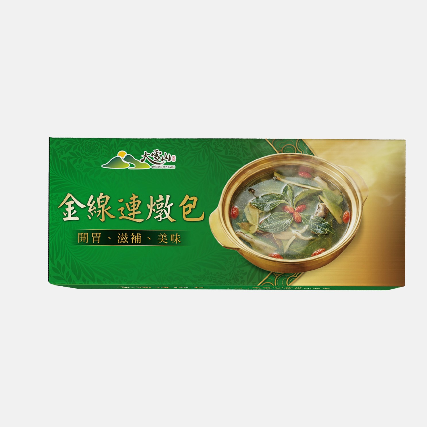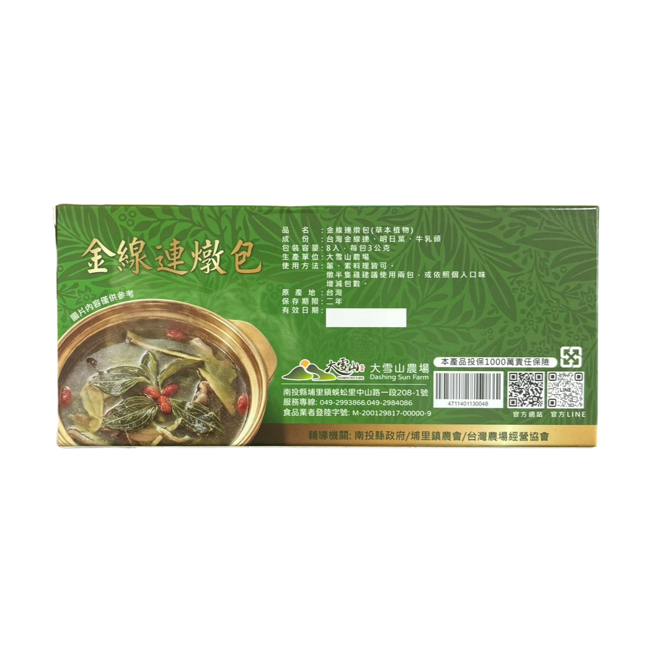 品名:金線連燉包(草本植物) 成分:台灣金線連、明日葉、牛乳頭 重量:8入,每包3g 使用方式: *葷、素料理皆可。 *燉半隻雞建議使用兩包,或依照個人口味增減包數。 原產地:台灣 保存方法:避免陽光直射和避免置放於潮濕的地方 備註:寄送國外請先和農場聯繫:2993866@gmail.com